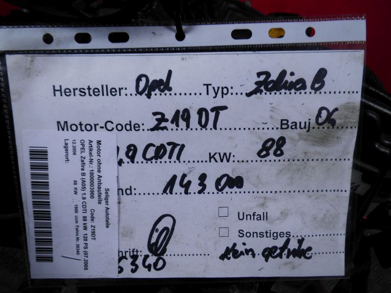 Motor ohne Anbauteile (Diesel) OPEL Zafira B (A05) 1.9 CDTI 88 kW 120 PS (
