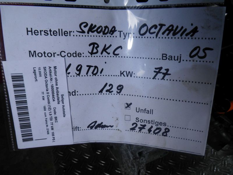 Motor ohne Anbauteile (Diesel) SKODA Octavia II Combi (1Z) 1.9 TDI 77 kW 10