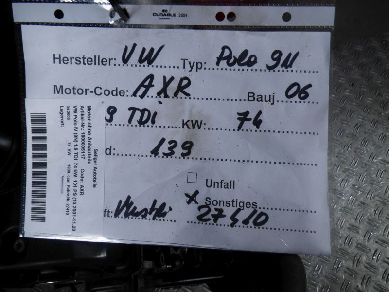 Motor ohne Anbauteile (Diesel) VOLKSWAGEN POLO (6N_) 1.9 TDI
