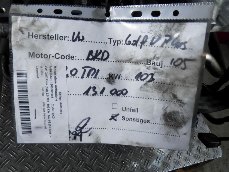 Motor ohne Anbauteile (Diesel) VW Golf Plus (5M) 2.0 TDI 103 kW 140 PS (